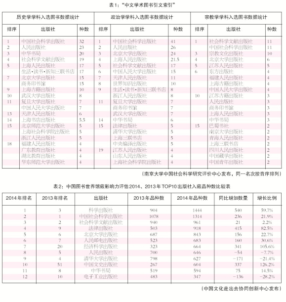 评价出版社学术影响力最为核心的两个指标——“中文学术图书引文索引”入选图书数据和中国图书世界馆藏影响力调查报告(2015版)近日发布。发布单位南京大学中国社会科学研究评价中心和中国文化走出去协同创新中心认为,这两个指标体系为学术图书评价提供了量化标准,为完善我国哲学社会科学学术评价体系提供了更全面的数据支撑,为中华优秀学术成果走出去提供了新的评价路径。两项数据综合显示,长期以来,坚持走哲学社会科学专业出版道路、努力打造学术精品的中国社会科学出版社在人文社科领域均排名居首。