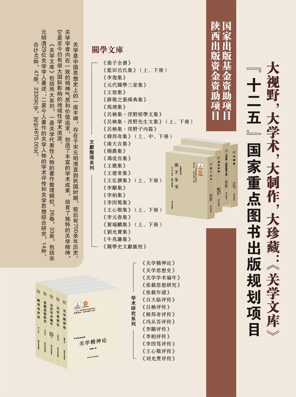 早在2007年西北大学出版社即提出了出版《关学文库》丛书的选题策划方案,2010年该项目获批为国家出版基金资助项目,2011年项目正式启动。西北大学出版社组织国内高校、研究机构的上百位专家学者、审定人员和编校人员历时5年,精雕细刻,校雠勘误,以打造学术精品,出版传世之作为目标,以继承、弘扬和创新中华文化为宗旨,以文献整理的系统性、学术研究的开拓性为特点,使其成为我国第一部对上起于北宋、下迄于清末民初,绵延800余年的关中理学的学术文献资料进行整理与反映综合研究成果的大型丛书。