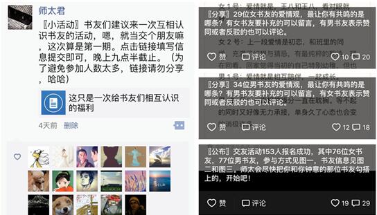 2. 情人节读者交友活动:在情人节期间,结合年轻读者群体的痛点和需求,开展了读者线上交友活动。同有153位单身青年书友(76位女书友,77位男书友)参与到最终的交友活动中。该活动进一步调动了书友群的活跃程度。