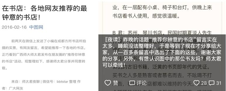 3. 每日书友夜聊活动:为了保持群运营的日常化,并为我社各新媒体平台提供高质量的原创内容,初期设置了每日书友夜聊活动,征集书友们对不同话题的观点和讨论,每晚留言量平均达到100人次。截止目前,夜聊活动已经进行了6期,收集了一批优质的内容资源,其中“全国各地网友推荐最钟意的书店”授权中国图书网首发。
