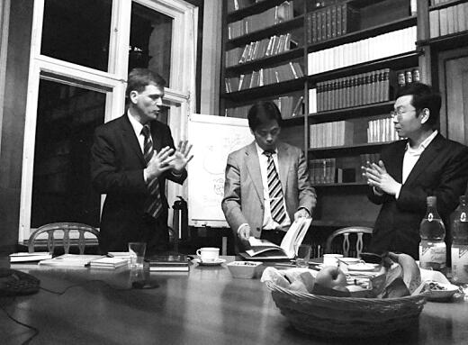 上海交通大学出版社社长韩建民、副社长李广良与德古意特出版社副总裁亚历山大·格罗斯曼讨论合作,顺利达成“光物理研究前沿系列丛书”(全8种)英文版版权输出协议。 上海交通大学出版社 供图