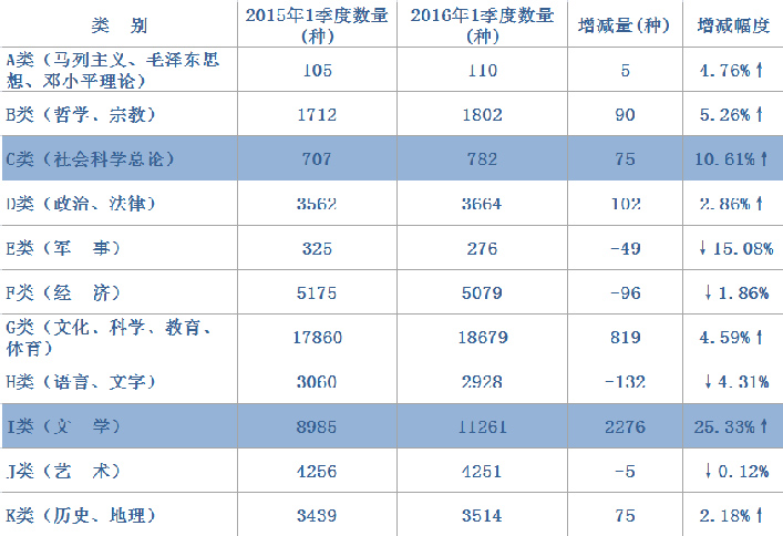 从2016年1季度选题结构分布来看,与去年同期相比,按照中图法的二十二个大类划分,十二个大类上涨,十个大类下降(见表1)。其中,I类(文学)同比上涨25.33%,增加2276种,是上涨幅度最大、数量增加最多的大类。