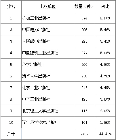 共有340家出版单位出版工业技术图书,占全国出版单位五成多,占比57.43%。在排名前十出版单位中,专业科技社占据绝对优势,包括8家科技社和2家大学社。前十占比44.43%,超过四成(见表13)。