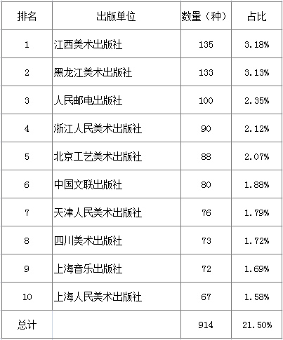 共有384家出版单位出版艺术图书,占全国出版单位六成多,占比64.86%。在排名前十的出版单位中,8家是美术出版社,专业美术社优势明显(见表15)。