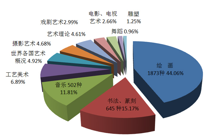 在艺术类的11个细分种类中,绘画图书占四成多,数量在千种以上;书法、篆刻数量在600种以上;音乐数量在500种以上,三类共占七成多。其余种类数量均在300种以下(见图8)。