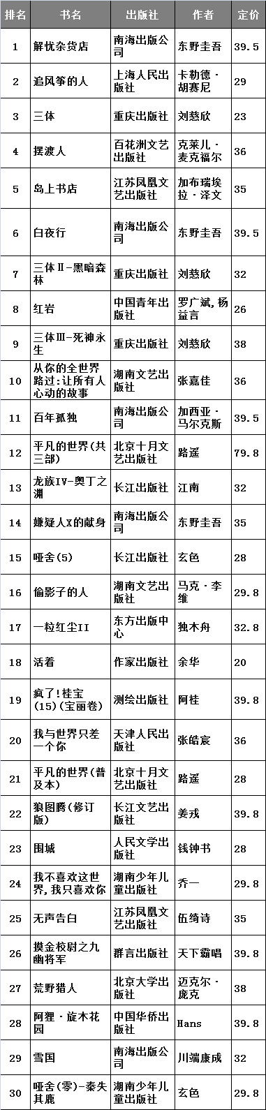 虚构类畅销书榜 TOP30