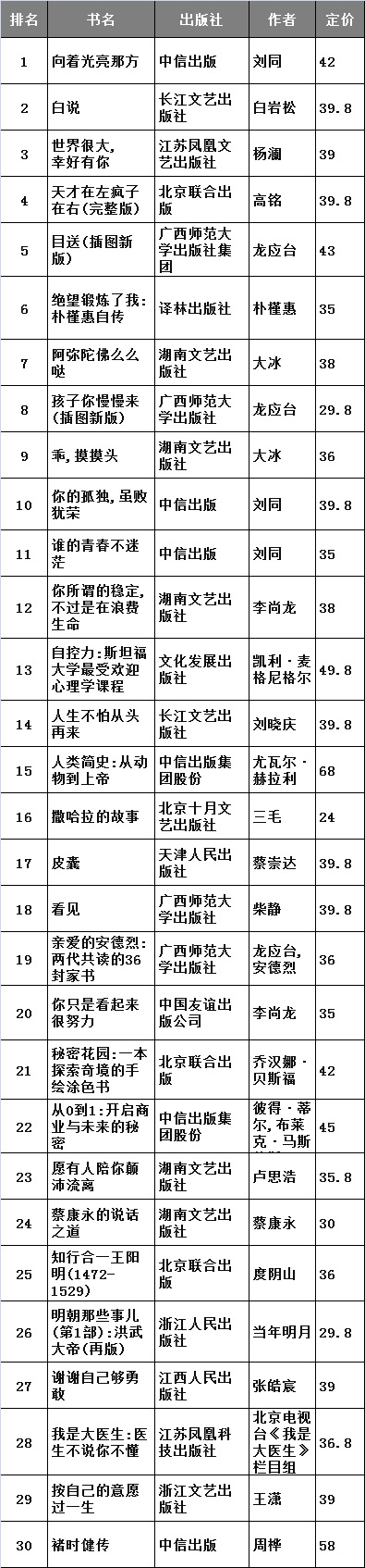 非虚构类畅销书榜:刘同新书位列榜首