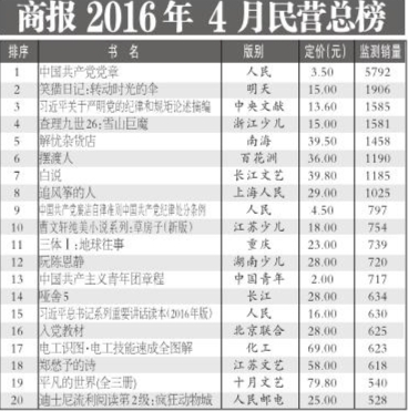 从民营零售总榜前20名图书来看,位列榜首的为时政书《中国共产党党章》。该书5792册的月销量,与3月销量榜首位的《习近平关于严明党的纪律和规矩论述摘编》一书相比,多出1400余册,但与3月上榜7种时政图书共17198册的销量相比,4月时政书仅有5个品种共9521册销量,销量下滑明显。
