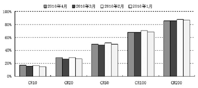 2016年4月,整体市场中CR10、CR20、CR50、CR100和CR200分别为17.59%、29.07%、49.61%、67.92%和85.69%。从环比来看,CR10、CR20和CR50上升,升幅分别为2.10、2.43和0.97个百分点;CR100和CR200下降,降幅分别为0.19和0.16个百分点。从近四个月CR10表现来看,整体市场CR10先升后降再上升,为近四个月最高,较2016年1月、2月和3月分别上升了2.45、0.68和2.10个百分点,市场份额集中趋势有所加剧。