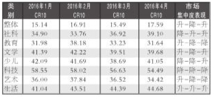 表1 近四个月整体和细分市场出版社集中度CR10比较