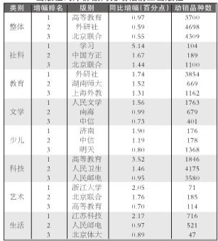 表3 整体和细分市场 出版社码洋份额同比增幅前三出版社