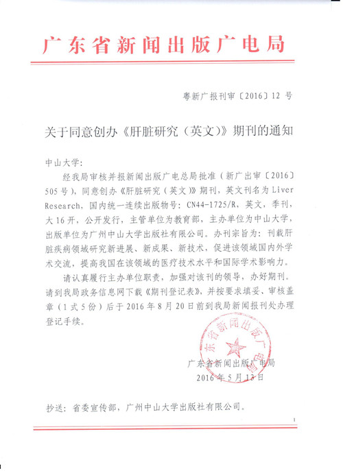 近日,中山大学出版社收到广东省新闻出版广电局《关于同意创办<肝脏研究>(英文)期刊的通知》(粤新广报刊审〔2016〕12号),由中山大学主办的《肝脏研究(英文)》期刊正式获得新闻出版广电总局批准创办。该期刊英文刊名为Liver Research,主管单位为教育部,主办单位为中山大学,出版单位为广州中山大学出版社有限公司。