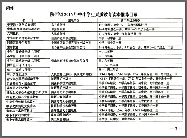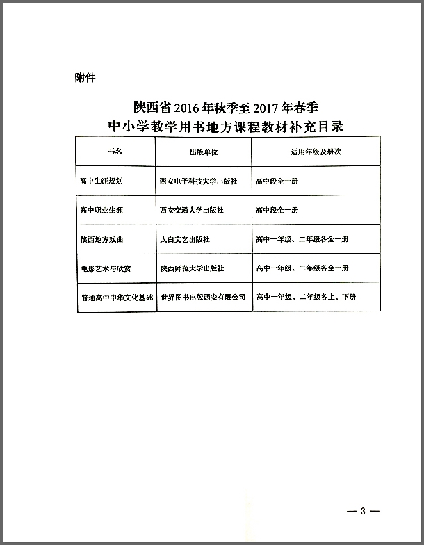 6月16日,陕西省教育厅印发《陕西省2016年秋季至2017年春季中小学教学用书地方课程教材补充目录》和《陕西省2016年中小学生素质教育读本推荐目录》,陕西师范大学出版社《电影艺术与欣赏》《中小学校园足球》《社会主义核心价值观青少年读本》《中华优秀传统文化读本》等四种新增教材、读本列入目录,成绩喜人。