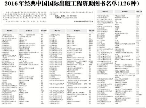 根据《关于实施经典中国国际出版工程的通知》,国家新闻出版广电总局经典中国国际出版工程办公室自2016年1月正式启动2016年项目申报和评审工作。经过前期审核、评审委员会评审,确定了67家出版机构的126个品种入围。现将名单予以公示,接受社会监督。
