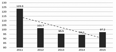 “十二五”期间全国整体市场零售指数如图1-1所示。从全国整体市场来看,“十二五”开局之年(2011年),全国图书零售指数达到了123.3点的峰值。但从2012年开始出现了大幅下降,2014年甚至降至94.1点的谷值,相比2011年下降了29.2点。2015年则开始缓慢上升,零售指数为97.2点,同比增加了3.1点。可见,“十二五”期间,全国图书零售出现了先大幅下降而后缓慢回升的态势。