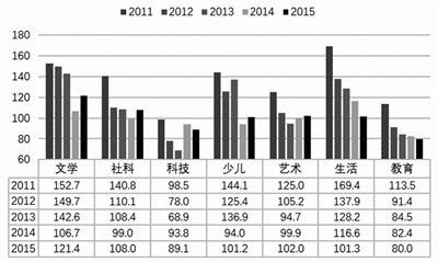 “十二五”期间全国七大类细分市场零售指数如图1-2所示。从各细分市场来看,文学类零售指数在“十二五”前三年呈缓慢下降趋势,2014年大幅降至106.7点的谷值,2015年回升到121点以上;社科类零售指数在2011年达到140.8点的峰值,自2012年开始大幅下降,2014年降至99.0点的谷值,2015年回升到100点以上;科技类零售指数在2011年达到98.5点的峰值,自2012以后大幅下降,2013年降至68.9点的谷值,2014年回升到93.8点,2015年略有下降;少儿类零售指数呈现波动行情,历经降-升-降-升的趋势,尤其是2013年同比下降了11.5点;艺术类零售指数以2013年的谷值为界,前两年呈现较明显的下降而后两年呈现缓慢回升;生活类零售指数呈现出较大的单一的下降趋势;教育类零售指数也呈现持续下滑之势,但降幅要小于生活类。