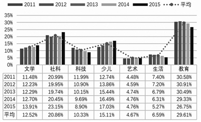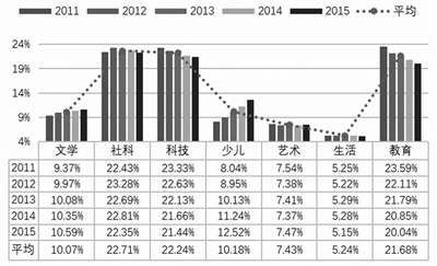 “十二五”期间整体市场动销品种份额如图1-4所示。动销品种份额前三甲为社科类、科技类和教育类,分别在22.3%~23.3%、21.4%~23.4%和20%~23.6%之间,平均动销品种份额均在21.5%以上,尤其是前两类相差更小,均在22.2%以上。排在第4、5位的是少儿类和文学类,平均动销品种份额较为相近,均在10%以上。在这五年中,文学类和少儿类的动销品种份额同比都保持了稳定增长,增幅分别在0.1~0.6和0.9~1.3个百分点之间;科技类和教育类同比都出现了持续下滑,降幅分别在0.2~0.7和0.3~1.5个百分点之间;其他几类均有上下波动,幅度较小。