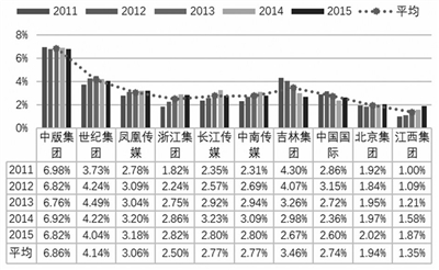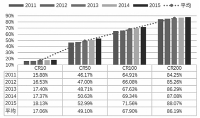 图2-1 2011~2015年出版集团TOP10码洋份额