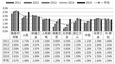“十二五”期间出版社TOP10如图3-2所示。码洋份额遥遥领先的是百年老社商务印书馆,在2.3%~2.8%之间,平均码洋份额接近2.6%。排在第2位的是机械工业出版社,在1.8%~2.2%之间,平均码洋份额为2%。人民出版社排在第3位,在1.7%~2.6%之间,平均码洋份额接近2%,与机械工业出版社颇为接近。化学工业出版社、人民邮电出版社和外研社3家平均码洋份额均在1.5%~1.7%之间,相差不大,属于同一阵营。浙江少年儿童出版社、湖南文艺出版社和中信出版社3家平均码洋份额均在1.2%~1.5%之间,也属于同一阵营。北京联合出版公司垫底,平均码洋份额不到0.8%。在这五年中,湖南文艺社和北京联合都保持了稳定增长,增幅分别为0.1~0.4和0.05~0.8个百分点;机械工业社出现了持续下降,降幅在0.04~0.1个百分点之间;其他出版社均有上下波动,幅度较小。