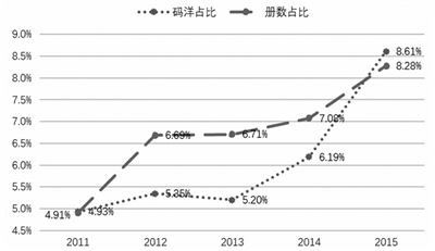 图4-1 2011~2015年畅销书TOP100码洋与册数占比