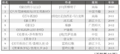 “十二五”期间畅销书TOP20如表4-1所示。下表不包括主题图书和教材教辅类图书。在畅销书TOP50中,从类别来看,少儿类图书销售人气最高,入选了35种,占70%,其中主要是雷欧幻像的“查理九世”系列,也包括刚刚获得国际安徒生奖的曹文轩的《草房子》。排在第2位的是文学类,有9种入选,占18%,其中青春文学就有3种,包括郭敬明的《小时代3.0》《临界·爵迹(下)》和张嘉佳的《从你的全世界路过》。社科类排在第3位,有2种入选,占4%,都属于引进版。科技类也有2种入选,占4%。教育类和艺术类各有1种,均占2%,前者为《好妈妈胜过好老师》,后者为《秘密花园》,均为引领图书市场的畅销书。从出版社来看,浙江少儿出版社遥遥领先,有25种入选,占50%;明天出版社排在第2位,有7种入选,占14%;长江文艺出版社和南海出版公司均有3种入选,排在并列第3位,占6%;湖南文艺出版社有2种入选,排在第4位,占4%;作家出版社、中信出版社等10家各有1种入选,均占2%。