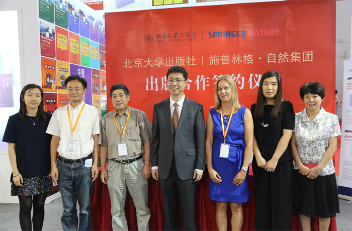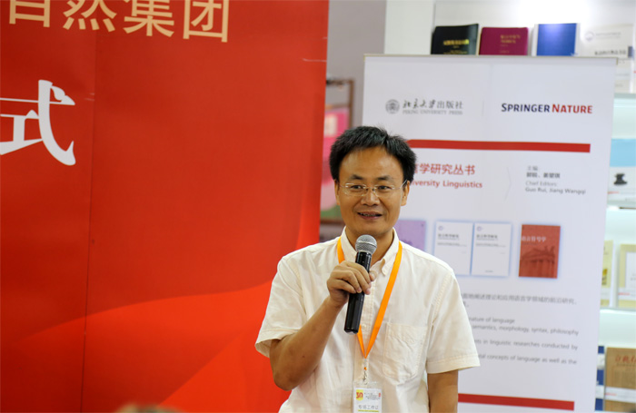 2016年8月25日上午,北京大学出版社与施普林格·自然集团“北大语言学研究丛书”及“语言学前沿丛书”合作出版签约仪式在新国展西2馆隆重举行。北京大学出版社社长王明舟先生、总编辑张黎明先生,施普林格·自然集团社会科学与哲学编辑总监Myriam Poort女士,丛书主编、北京大学中国语言学研究中心郭锐教授、香港理工大学北京联络处李东航副主任等嘉宾出席了此次签约仪式。