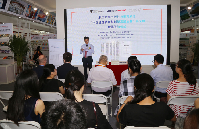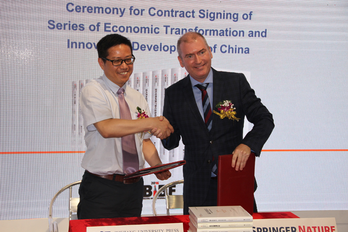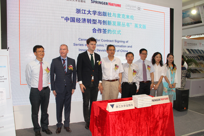 本网讯 8月24日,第二十三届北京国际图书博览会开幕当天,浙江大学出版社与施普林格•自然(Springer Nature)出版集团下属品牌帕尔格雷夫•麦克米伦(Palgrave Macmillan)公司合作出版《中国经济转型与创新发展丛书》英文版签约仪式在浙江省展区顺利举行。国务院新闻办公室对外推广局李智慧副局长、浙江省新闻出版广电局单烈副局长出席此次活动。
