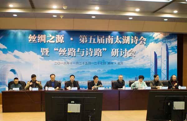 以“丝绸之源”为主题的“第五届南太湖诗会暨‘丝路与诗路’研讨会”,于11月25日至27日在浙江湖州吴兴区举行。本届诗会由浙江省作家协会、湖州军分区政治部、湖州市文联、吴兴区委宣传部共同举办,吴兴区文联、湖州市作家协会、吴兴区作家协会、丝绸小镇承办,湖州文学院、湖州市朗诵协会协办。来自“丝绸之路”沿线省市区诗人代表和全国各地的著名诗人,以及湖州本地诗人共80余人参加了诗会活动。
