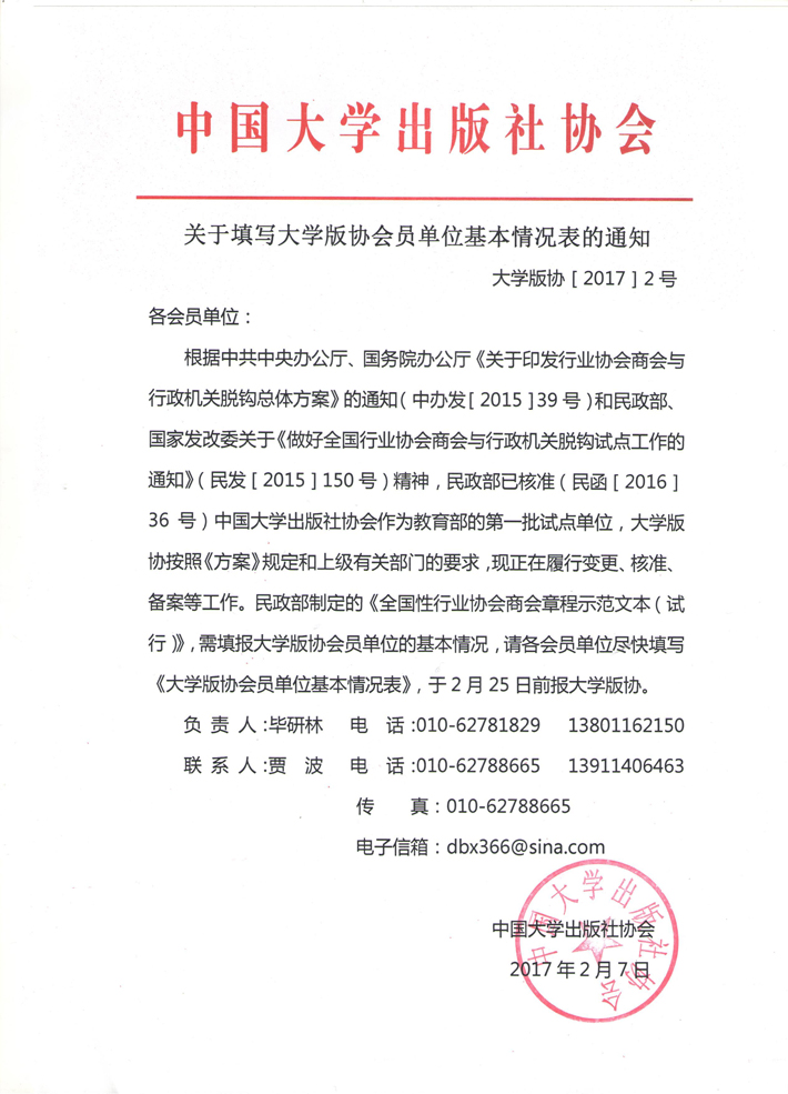 根据中共中央办公厅、国务院办公厅《关于印发行业协会商会与行政机关脱钩总体方案》的通知(中办发[2015]39号)和民政部、国家发改委关于《做好全国行业协会商会与行政机关脱钩试点工作的通知》(民发[2015]150号)精神,民政部已核准(民函[2016]36号)中国大学出版社协会作为教育部的第一批试点单位,大学版协按照《方案》规定和上级有关部门的要求,现正在履行变更、核准、备案等工作。民政部制定的《全国性行业协会商会章程示范文本(试行)》,需填报大学版协会员单位的基本情况,请各会员单位尽快填写《[大学版协会员单位基本情况表]》,于2月25日前报大学版协。