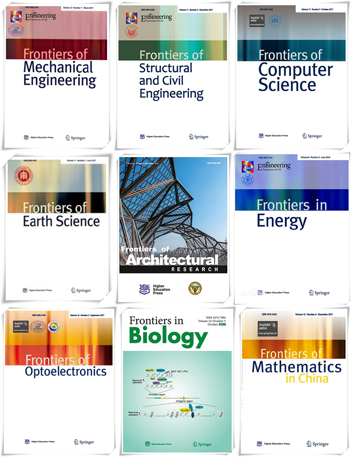 《Frontiers of Mechanical Engineering》 《Frontiers of Structural and Civil Engineering》 《Frontiers of Computer Science》 《Frontiers of Earth Science》 《Frontiers in Energy》 《Frontiers of Architectural Research》 《Frontiers of Optoelectronics》 《Frontiers in Biology》 《Frontiers of Mathematics in China》