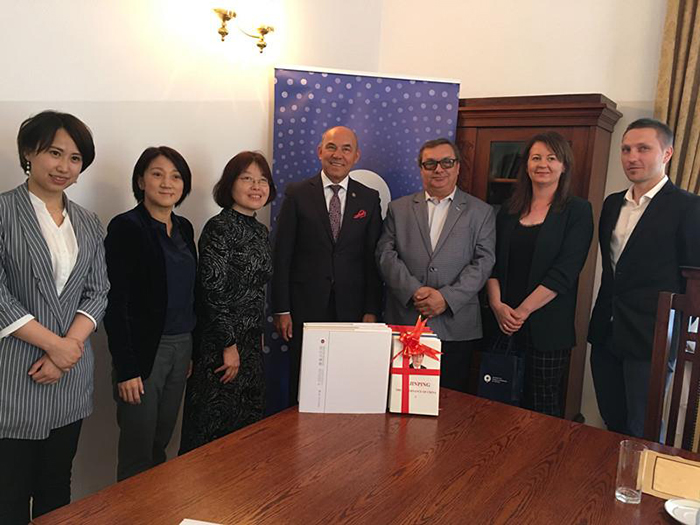书展结束后,人大出版社代表团一行访问了哥白尼大学并向哥白尼大学捐赠图书。哥白尼大学副校长Wojciech Wysota接待了代表团并介绍了哥白尼大学的基本情况。哥白尼大学是一所创建于1945年的高等学府,拥有17个学院,4000多名教职人员,25000名学生。该校不仅是波兰北部最大的综合性大学,在科研潜力、教育形式、开设的专业与课程数量、在校生与毕业生数量上都非常出众,是波兰最优秀的大学之一。人大社总编助理、新媒体出版中心主任费晓琳和人大社人文出版分社社长潘宇介绍了中国人民大学和人大社的基本情况。哥白尼大学已经与中国人民大学建立了合作关系,双方表示下一步可以加强出版方面的合作,将两国的优秀学术著作推介到各自国家。