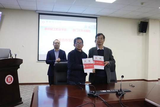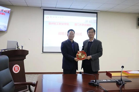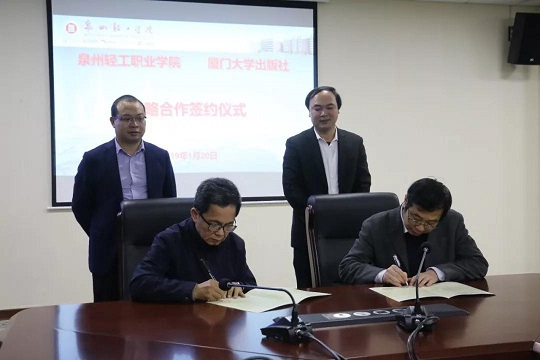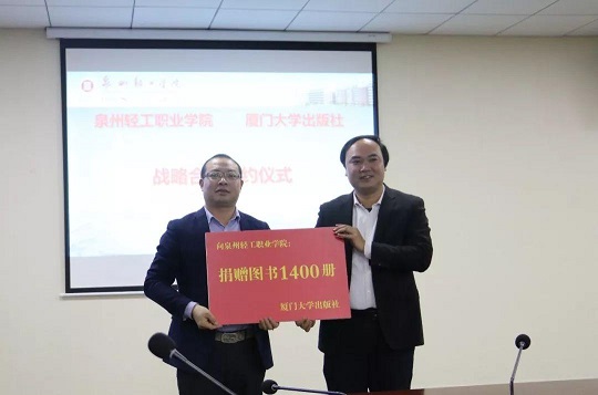 社长助理欧光江感谢泉州轻工学院对我社教材出版和发行工作长期的大力支持,并希望以战略合作协议为契机,开展教材建设,师资出版水平培训等全面深入的合作。随后黄茂林副书记与林松柏校长分别代表我社与泉州轻工职业学院签订了出版战略合作协议;施高翔副社长代表厦大出版社与林松柏校长互赠纪念品;欧光江代表厦大出版社向泉州轻工学院赠送图书,并回答了轻工学院教师代表提出的有关图书出版的各种问题。