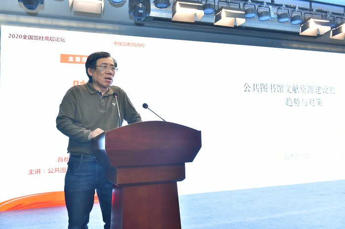 在随后的主旨报告环节,首都图书馆副馆长陈坚和湖北三新文化传媒公司总经理唐开慧先后作了《公共图书馆文献资源建设的趋势与对策》和《馆配市场发展报告(2015-2019)》的发言。