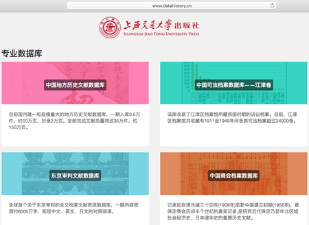 首先,不少大学出版社凭借在某一学科领域学术内容资源的专业性和独特性,相对精准地锁定目标用户群体,通过数据库的开发,摸索出一条清晰的转型路径。如上海交通大学出版社(简称“上海交大社”)经过多年的积累和探索,通过深挖内容资源、积极转换观念等,打造了中国地方历史文献数据库、中国司法档案数据库—江津卷、东京审判文献数据库和中国商会档案数据库,形成了特色鲜明的数字库产品矩阵。此外,该社正在开发和建设多个其他相关学术领域的数据库和云平台。人文社科类专业数据库建设已成为上海交大社学术出版数字化的典型特色。
