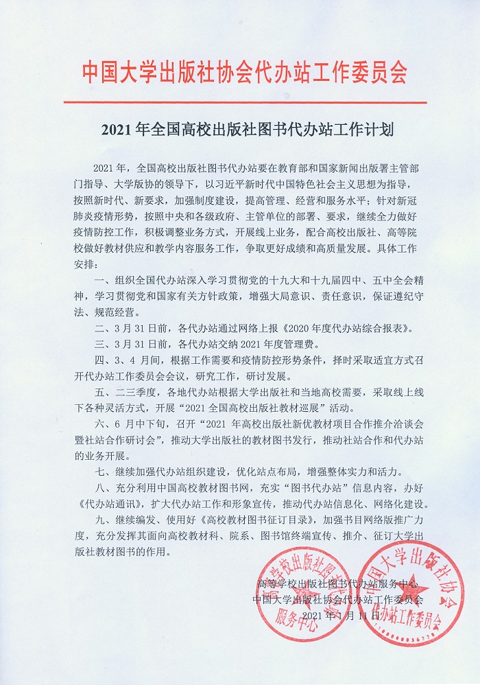 2021年,全国高校出版社图书代办站要在教育部和国家新闻出版署主管部门指导、大学版协的领导下,以习近平新时代中国特色社会主义思想为指导,按照新时代、新要求,加强制度建设,提高管理、经营和服务水平;针对新冠肺炎疫情形势,按照中央和各级政府、主管单位的部署、要求,继续全力做好疫情防控工作,积极调整业务方式,开展线上业务,配合高校出版社、高等院校做好教材供应和教学内容服务工作,争取更好成绩和高质量发展。具体工作安排: