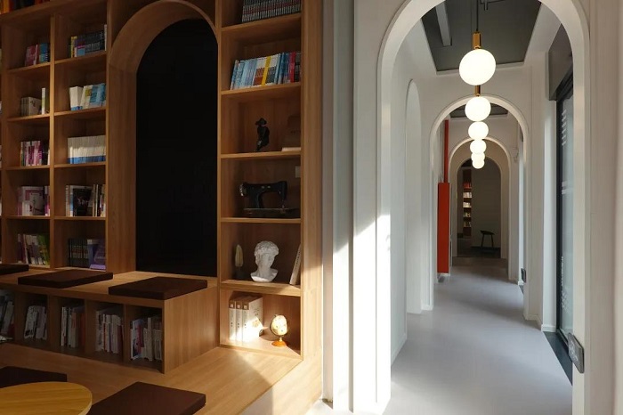 推开书店门,眼前是一个兼具艺术感与功能性的区域,类似阶梯的座位、满是书的通顶大书架、多组巨幅涂鸦黑板画,给读者提供了舒适“柔软”的阅读环境,也为著名学者、作家、设计新秀思维激烈碰撞提供一个理想的平台。文绮书店独特且带有异域风情的拱门廊道构造最为亮眼。书店的空间设计灵感,源于中国古典园林廊道的造景手法,在建筑的室内外之间穿插一个具有仪式感的门廊来达到步移景异的效果,设计师东华大学环境设计系黄更老师介绍说。书店又一“独到”之处就是门廊一侧的三间相互连通的“惊喜”小空间,在这里可以遇到学校师生最为前沿的时尚设计作品,邂逅匠心制作的东华周边文创,学校易班线下打印体验点更是贴心周到。特别的是,为了方便艺术设计专业的师生,书店还专门设置了绘图工具、服装面辅料及缝纫工具专区等,“让我们白天一起看书,晚上通宵画图!”