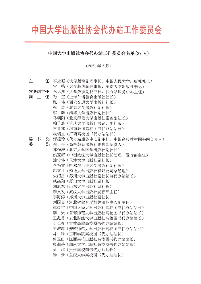 主 任:李永强(大学版协副理事长、中国人民大学出版社社长) 雷 鸣(大学版协副理事长、湖南大学出版社书记)常务副主任:岳凤翔(大学版协副秘书长、代办站服务中心主任)副 主 任:孙 玉(上海外语教育出版社社长) 张 伟(西安交通大学出版社社长) 张 涛(北京大学出版社副社长) 黎 鹰(清华大学出版社副社长) 马朝阳(北京师范大学出版社常务副社长) 柏子康(重庆大学出版社书记、副社长) 王亚林(河南教图高校图书代办站站长) 成端显(广西高校图书代办站站长)秘 书 长:浑燕珍(代办站服务中心副主任、中国高校教材图书网负责人)委 员:崔 平(高等教育出版社销售部负责人) 林强庆(北京大学医学出版社副社长) 姚亚辉(中国政法大学出版社社长助理、发行部主任) 油俊伟(天津大学出版社副社长) 李艳文(哈尔滨工业大学出版社副社长) 赵立才(延边大学出版社有限公司总经理) 朱绍昌(苏州大学出版社副社长兼代办站站长) 施高翔(厦门大学出版社副社长) 刘旭东(山东大学出版社副社长) 李义发(武汉大学出版社发行部主任) 李海涛(郑州大学出版社副社长) 刘国良(河北省教育厅机关服务中心副主任) 律蕴哲(中国人民大学出版社高校图书代办站站长) 李 梁(首都师范大学出版社高校图书代办站站长) 王兆勇(东北财经大学出版社高校图书代办站站长) 于长春(吉林高教高校图书代办站站长) 王洁萍(安徽师范大学出版社高校图书代办站站长) 马 腾(三明学院高校图书代办站站长) 仲玉山(江西高校出版社高校图书代办站站长) 廖湘岳(湖南大学出版社高校图书代办站站长) 吴 斌(贵州高校图书代办站站长) 滕 云(重庆大学高校图书代办站站长) 沈 丹(四川高校图书代办站站长) 王建安(西安交通大学高校图书代办站站长) 王亚民(甘肃沁园高校图书代办站站长)