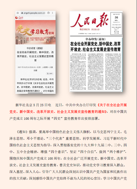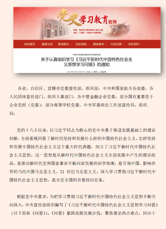 近日,中共中央办公厅印发《关于在全社会开展党史、新中国史、改革开放史、社会主义发展史宣传教育的通知》,对在中国共产党成立100周年之际开展“四史”宣传教育作出安排部署。根据相关文件精神,《中国共产党简史》《习近平新时代中国特色社会主义思想学习问答》为中央确定的党史学习教育指定学习材料,现已由人民出版社出版发行。通知中明确作为重要参考材料的《中华人民共和国简史》《改革开放简史》《社会主义发展简史》即将出版发行。