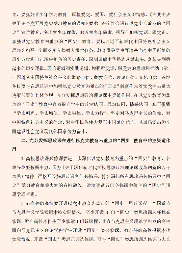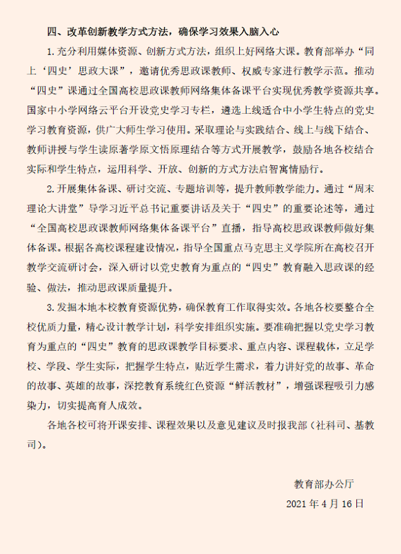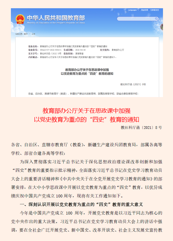 高校作为意识形态工作的前沿阵地,肩负着培养社会主义事业合格建设者和可靠接班人的历史使命。2021年4月16日,教育部办公厅发布《关于在思政课中加强以党史教育为重点的“四史”教育的通知》,要求在全国大中小学思政课中开展以党史教育为重点的“四史”教育, 将在思政课中加强以党史教育为重点的“四史”教育作为落实党中央重大决策部署的具体体现,充分发挥思想政治理论课主渠道作用,有效提升学生的政治认同、思想认同、情感认同,真正做到“学史明理、学史增信、学史崇德、学史力行”,坚定对马克思主义的信仰、对中国特色社会主义的信念、对中华民族伟大复兴中国梦的信心 以昂扬姿态为全面建设社会主义现代化国家努力奋斗。