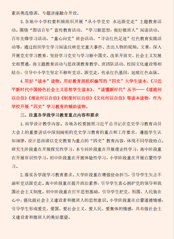 教育部要求,用好教育部组织编写的“四史”大学生读本、《习近平新时代中国特色社会主义思想学生读本》、“读懂新时代”丛书《道路何以自信》《理论何以自信》《制度何以自信》《文化何以自信》等读本读物,作为学校开展“四史”学习教育的辅助读物。