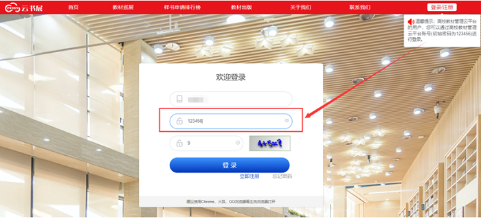 2.高校教材管理云平台的用户,可以通过高校教材管理云平台账号(初始密码为123456)进行登录;在云书展平台输入教材云的账号,输入初始密码123456进行登录,如下图所示。