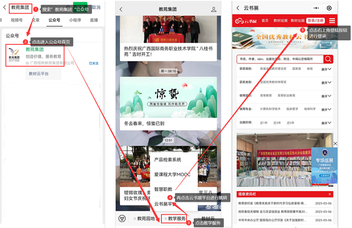 ①关注“教苑集团”公众号,点击教学服务—>选择云书展平台进入首页—>点击云书展平台图标进行跳转登录。