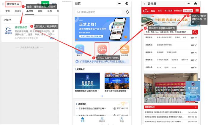 1.关注“壮志高校教材云”公众号,点击教材云—>选择学生订购与支付栏目进入首页,点击云书展平台图标进行跳转至云书展移动端—>点击右上角登录按钮进行登录账号,如下图所示: