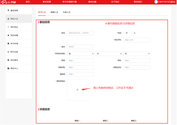 注意:注册账号登录后会弹出身份信息认证窗口,如果老师想申请样书的话需要选择教师认证后才可以进行样书申请的操作,老师进行样书申请后平台客服将会在1个工作日内进行认证审核(上传的凭证仅为教师资格证可认证通过),如下图所示。
