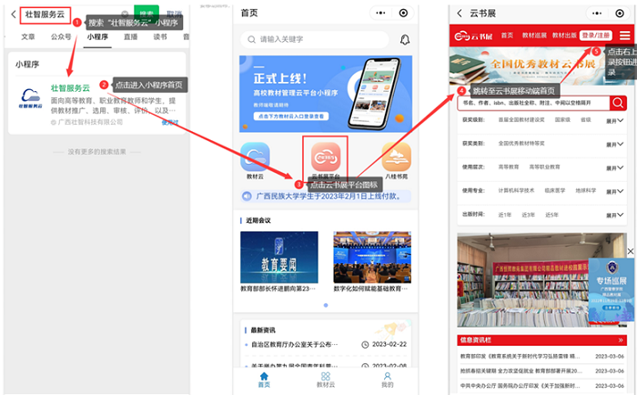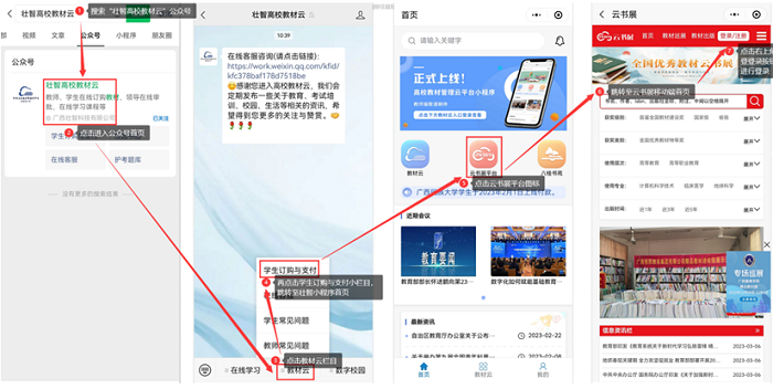 1.关注“壮志高校教材云”公众号,点击教材云—>选择学生订购与支付栏目进入首页,点击云书展平台图标进行跳转至云书展移动端—>点击右上角登录按钮进行登录账号,如下图所示: