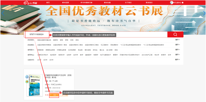 1.在平台首页搜索教材(可以进行书名、作者、书号、出版社等搜索条件进行查询)—>然后点击申请样书按钮—>跳转至样书申请页面,如下图所示: