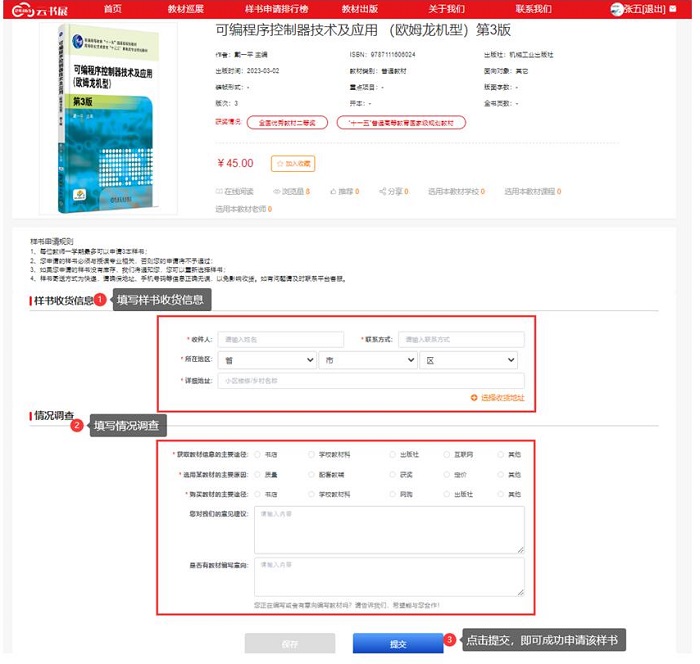 2.跳转至申请样书页面后—>填写样书收货信息以及填写情况调查再进行提交,带星号的为必填项,如下图所示: