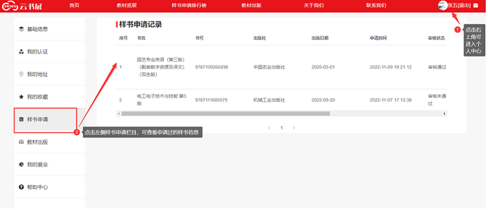 3.点击网页右上角进入个人中心页面—>再点击样书申请栏目,可查看申请过的样书信息。