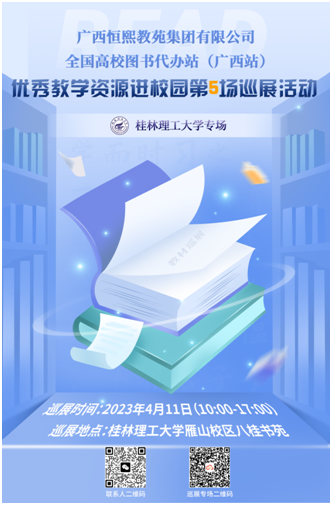 2023年4月11日,2023全国高校教材巡展(广西站)优秀教学资源进校园第5场巡展活动在桂林理工大学雁山校区八桂书苑举办。本次活动联合清华大学出版社、北京大学出版社等以教材出版为主的出版社开展线上线下相结合的方式进行展示交流,展出各社近三年出版的精品优秀教材、规划教材、获奖教材。