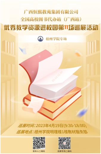 2023年4月19日,2023全国高校教材巡展(广西站)优秀教学资源进校园第11场巡展活动在梧州学院明理楼1楼教材服务部举办。